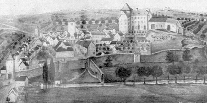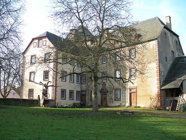 Die Anfänge der Burg Dudeldorf liegen im Dunkeln. Das sich nach dem Ort benennende Edelherrengeschlecht tritt in der urkundlichen Überlieferung erstmals 1052 mit Anselm von Dudeldorf in Erscheinung. Mit welcher der beiden um 1200 in Dudeldorf nachweisbaren Burgen die noch bestehende, in einen barocken Schlossbau integrierte Anlage identisch ist, lässt sich nach bisherigem Kenntnisstand nicht sagen. Im 14. Jh. erlischt das zu Dudeldorf ansässige Edelherrengeschlecht mit Nikolaus von Dudeldorf, der sich letztmalig 1373 nachweisen lässt. Knapp vier Jahrzehnte zuvor, hatte König Heinrich von Böhmen aus dem Hause der Grafen von Luxemburg den Bewohnern der bei den Burgen gelegenen Siedlung Stadtrechtsprivilegien gewährt und ihnen gestattet, den Ort mit einer Mauer zu umgeben. Gegen das benachbarte Kurtrier kam Dudeldorf innerhalb der luxemburgischen Territorialpolitik Bedeutung als Stützpunkt zu. Bis zur Französischen Revolution bildete Dudeldorf einen Grenzort des Herzogtums Luxemburg gegen Kurtrier. Die Burg zu Dudeldorf ging nach dem Erlöschen des Geschlechts von Dudeldorf Ende des 14. Jhs. an Laudolf von Bitburg über. Im Jahr 1491 wird Friedrich von der Leyen mit dem "Haus" der Grafen von Vianden zu Dudeldorf belehnt. 1586 gelangte Dudeldorf auf dem Erbweg an die Braun von Schmidtburg. Gottfried Heinrich Braun von Schmidtburg ließ auf dem Burggelände unter Einbeziehung eines mittelalterlichen Wohnturms 1734/35 ein zweiflügeliges Barockschloss errichten. Im Jahr 1813 erwarb Arnold Donat aus München die Burg Dudeldorf, und überließ einen Teil der Anlage der Stadt als Schule. Das Anwesen befindet sich bis heute in Privatbesitz und ist daher nur von außen zu besichtigen. (Jens Friedhoff)