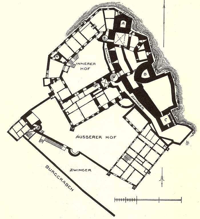 Die bauliche Entwicklung der vielgestaltigen Burg Runkel bedarf noch einer Klärung. Eine bauhistorische Untersuchung hat vor wenigen Jahren begonnen. Dem hochmittelalterlichen Kernbestand der Anlage gehören wesentliche Teile der Oberburg an, so z.B. der kielförmige Bergfried, der sich wahrscheinlich aus einem älteren Rundturm entwickelt hat. Die mächtige, der Unterburg zugewandte Schildmauer datiert sehr wahrscheinlich ins ausgehende 13. oder beginnende 14. Jh. Etwa zur gleichen Zeit dürfte der an der Nordseite der Oberburg gelegene fünfeckige Turm angelegt worden sein, dessen flache Spitze sich Richtung Schadeck wendet. Die Ringmauer der Unterburg, die zum Teil feldseitig mit ihrem Rundbogenfries noch erkennbar ist und an die sich hofseitig Wohnbauten anlehnen, gehört sehr wahrscheinlich ebenfalls dem 14. Jh. an. Der auf einem Kupferstich von Matthäus Merian 1646 wiedergegebene schmale Aufsatz auf dem Bergfried (Butterfassturm) könnte - analog zu Vergleichsbeispielen aus dem Mittelrheingebiet und aus Hessen - im 15. Jh. entstanden sein. Der äußere Torbau mit zwei flankierenden Rundtürmen, die Feuerwaffenschießscharten aufweisen, ist sehr wahrscheinlich ebenfalls ins 15. Jh. zu setzen. Im 16. Jh. wurde offenbar die Oberburg architektonisch überformt. Auf dem Stich von Merian ist deutlich ein Gebäude auf der Schildmauer mit einer bewegten, von Renaissance-Zwerchhäusern geprägten Dachlandschaft zu sehen. Ein Giebel der Unterburg weist einen geschwungenen Renaissancegiebel auf. Der Aufsatzturm auf dem Bergfried trägt ebenso wie der im Süden der Oberburg gelegene viereckige Turm eine welsche Haube. Der Südturm verfügt zusätzlich über eine Laterne. Weitere bauliche Veränderungen der Unterburg erfolgten im 17. und 18. Jh. An die Stelle des Renaissanceflügels im Süden des Burgareals trat 1701-03 ein schlichter barocker Baukörper. (J.F.)