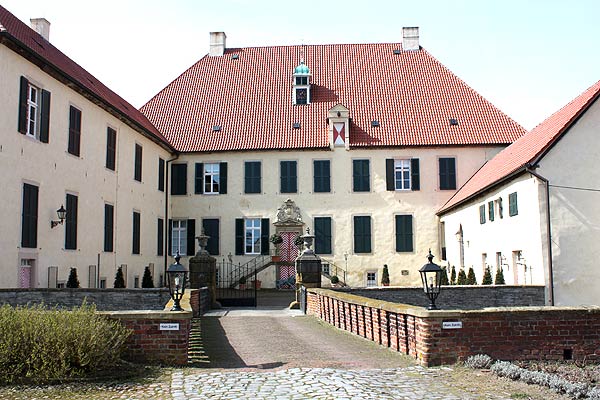 Eine Zweiinselanlage mit einer durch Doppelgraben und dazwischenliegendem Wall geschützten Hauptinsel. Das Haupthaus besteht aus einer Dreiflügelanlage aus verputztem Bruchstein. Auf der Vorburg stehen zwei Reihen von Wirtschaftsbauten mit Ecktürmen an der Ostseite. Außerhalb der Gräfte liegen langgestreckte Stallungen. Eine Insel inmitten der Gräfte im Süden wurde früher als Bleiche genutzt. Südlich des Wasserschlosses liegt die Rentei aus dem Ende des 18. Jhs. (S.E.)