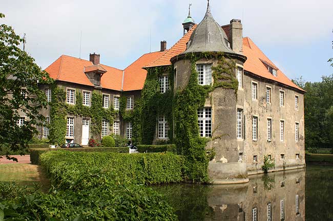 Über das Aussehen der mittelalterlichen Burg ist nichts bekannt. Das Schloss besteht aus einer Zwei-Insel-Anlage. Die Hauptinsel mit dem Herrenhaus, einer nach Süden geöffneten Dreiflügelanlage mit zwei runden Pavillontürmen an den Ecken, steht auf einer von einem doppelten Wassergraben umgebenen, unregelmäßig geformten Insel. Im Herrenhaus selbst ist der von Schlaun entworfene, mit Stuck verzierte Saal herauszuheben. Im Süden und Westen schließt sich ein teilweise von Wassergräben umschlossener barocker Landschaftsgarten an. (S.E.)