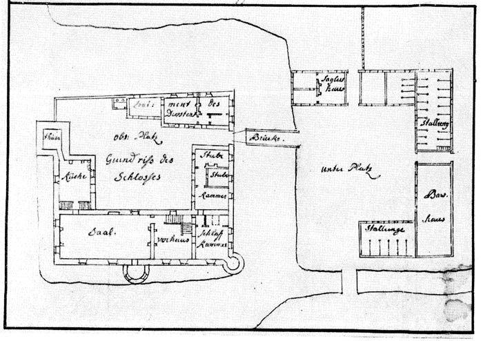 Nach einem Grundriss von 1740 bestand das Schloss aus einer im Nordwesten offenen Vierflügelanlage mit jeweils einem Rundtturm an der Südost- und Südseite. Den nördlichen Abschluss des Westflügels bildet ein großer Eckturm. Im Osten befindet sich die Vorburg mit einem dreiflügeligen Wirtschaftsgebäude. Die Gräften sind zu diesem Zeitpunkt schon teilweise verfüllt. (S. Eismann)