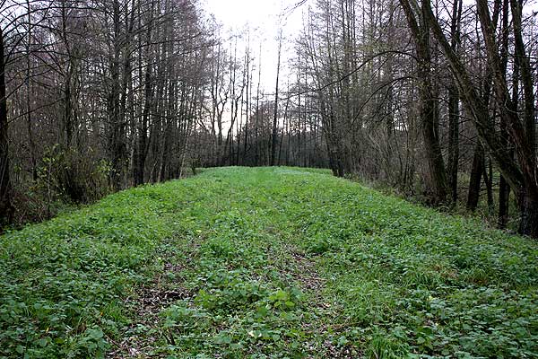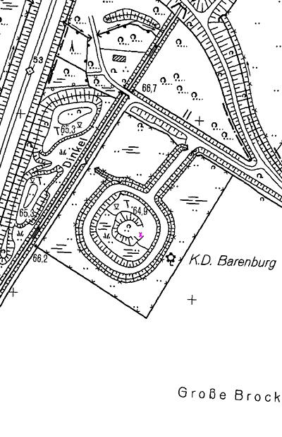 ca. 16 m breiten, wasserführenden Graben und einem ca. 1 m hohen und 10 m breiten Wall. Dieser wird außen von einem weiteren 5-6 m breitem Graben begleitet. Im Nordosten befindet sich ein dammartig erhöhter Zufahrtsweg (Länge: 60 m, Breite: 10 m, Höhe: 1,50m), der von bis zu 6 m breiten Gräben flankiert wird. Den Anschluss an die Innenfläche stellte eine Holzbrücke her, von der einige Hölzer auf dem Grund der Innengräfte gefunden wurden. (Stefan Eismann)