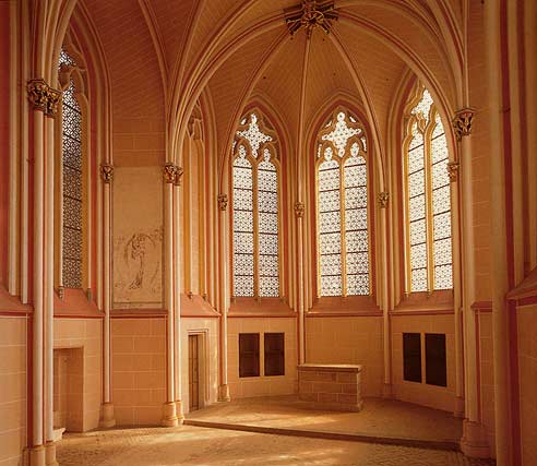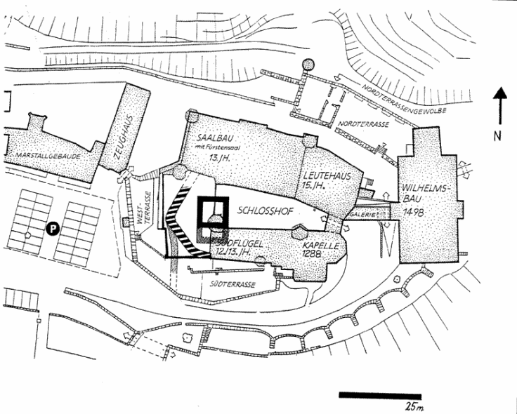 Der Kernbereich des am Ende eines steilen Bergsporns über dem Lahntal gelegenen Schlosses besteht aus einer hufeisenförmigen, dreiflügeligen Gebäudegruppe um einen schmalen, trapezförmigen Binnenhof mit Zugang im Osten. Westlich unterhalb der Kernburg befindet sich die Vorburg. Vom ältesten Baubestand des Schlosses aus dem 11. Jh. blieben unter der im Kern gotischen Gesamtanlage Reste eines quer zur Längsachse der Burg stehenden Gebäudes (16 x 9,5 m, Mauerstärke 1,75 m) unter dem heutigen Westflügel erhalten. Ob es sich um einen Saalbau oder einen Wohnbau gehandelt hat, lässt sich nicht mit letzter Sicherheit sagen. In einer jüngeren Bauphase entstand um 1140 im Auftrag der Landgrafen von Thüringen unter Verwendung von Teilen des Vorgängerbaus ein an der westlichen Angriffsseite der Burg gelegener viereckiger Turm, der von einer teilweise nachweisbaren Wehrmauer umgeben war. Die Gebäude des Süd-, Nord- und Westflügels gehören im Wesentlichen einer Mitte des 13. Jh. einsetzenden Bauphase an, die vermutlich zu Beginn des 14. Jh. abgeschlossen war. Der dreigeschossige Südflügel, dessen stadtseitige Front durch ein großes dreiteiliges Maßwerkfenster von 1481 akzentuiert wird, umfasst im mittleren Teil den landgräflichen Wohnbau, die so genannte "Alte Residenz"- Ursprünglich in Fachwerkkonstruktion errichtet, wurden die Erkeraufbauten im 18. Jh. in Stein neu aufgeführt. Im zweiten und dritten Geschoss enthält der Baukörper je zwei Säle. Den östlichen Abschluss des Südflügels bildet die 1288 der Hl. Katharina geweihte Schlosskapelle, die stilistisch den Übergang von der Früh- zur Spätgotik markiert. Die Ausmalung wurde 1970/71 wiederhergestellt. Beachtung verdienen ein Fußbodenmosaik aus farbig glasierten Tonplättchen (um 1300) sowie die Reste von Wandmalereien (in der Westnische Christopherus, um 1300). An der Südostseite unterhalb der Kapelle befindet sich ein 1572 von Eberdt Baldewin geschaffener Renaissancebau mit offener Arkadenhalle und Volutengiebeln. Die Nordseite des Burghofs nimmt der Saalbau ein, der über einem hohen Keller zwei Hauptgeschosse aufweist. An der West- und an der Nordseite befinden sich starke Wandpfeiler, die an den Ecken als freistehende Türmchen (Tourellen) mit Wendeltreppen gestaltet sind. Die Mitte der Nordseite nimmt ein risalitartiger Vorbau mit Staffelgiebel ein. Vor der Hoffront ermöglichte ursprünglich ein Vorbau mit Freitreppe den Zugang zum Saal. Der das gesamte Obergeschoss einnehmende zweischiffige Fürstensaal (33 m lang und 14 m breit, 7,80 m hoch) zählt zu den größten profanen Innenräumen der deutschen Gotik. Als ursprünglich quer angelegter Saal konzipiert mit dem Eingang an der dem Hof zugewandten Längsseite und dem gegenüber liegenden Thronsitz des Landgrafen in dem gegenüberliegenden Risalitvorbau steht der Raum in der Tradition der Saalbauten von Kaiserpfalzen. Östlich schließt sich an den Saalbau der ehemalige Küchenbau (Leutehaus) mit je einem Saal im ersten und zweiten Obergeschoss an. Der Westflügel des Hauptschlosses, der auch als Frauenbau bezeichnet wird, beherbergt in seinen Obergeschossen zwei große flachgedeckte Säle. An der Hoffront befindet sich der im 16. Jh. neu gestaltete Treppenturm. Östlich des Hauptschlosses befindet sich der 1493-1497 von dem hessischen Hofbaumeister Hans Jakob von Ettlingen errichtete Wilhelmsbau, der 1625/26 durch eine Galerie (in ihrer jetzigen Form ein Neubau von 1870) mit den Gebäuden der Kernburg verbunden wurde. Im Bereich der Vorburg, westlich des Schlosses blieben der Marstall (16. u. 17. Jh. auf älterem Untergeschoss errichtet) und das 1568/69 von dem Baumeister Eberdt Baldewin errichtete Zeughaus erhalten. In unmittelbarer Nähe zum Halsgraben erhebt sich der 1478 von Hans Jakob von Ettlingen aufgeführte Weiße Turm (Hexenturm). Der Geschützturm diente von 1550 bis 1864 als Gefängnis. Nur wenige Reste künden von der einst bedeutenden, vornehmlich im 16. und 17. Jh. entstandenen Außenbefestigung des Schlosses, die zu Beginn des 19. Jh. geschleift wurde. (J.F.)