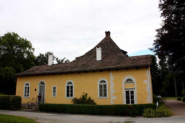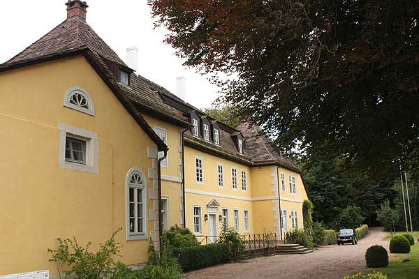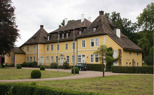 Das spätbarocke Herrenhaus besteht aus einem zweistöckigen Rechteckgebäude aus verputztem Fachwerk mit Mansardwalmdach. An den Seiten weist es quadratische Eckpavillons mit Zeltdächern und niedrige Anbauten auf. (Stefan Eismann)