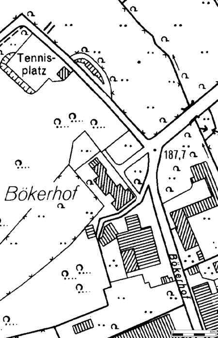Die Anfänge des als Niederungsburg anszuprechenden Adelssitzes Bökerhof liegen im Dunkeln. Vermutlich handelt es sich um eine spätmittelalterliche Gründung. Infolge der bislang nicht aufgearbeiteten urkundlichen und archivalischen Überlieferung zu dem Anwesen lassen sich keine Aussagen zur Baugestalt und baulichen Entwicklung der Anlage vor dem spätbarocken Neubau des Bökerhofes 1769-1771 machen. (Jens Friedhoff)