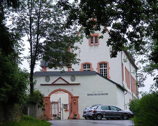 Die in der Barockzeit ausgebaute Burg Bollendorf, über dem gleichnamigen Ort an der Sauer gelegen, zählt zu jenen Burgen, die bislang nur unzureichend untersucht worden sind. Problematisch ist u. a. die zeitliche Einordnung der Burg. 776 erhielt die Abtei Echternach Güterschenkungen in Bollendorf. Diese Nachricht steht jedoch in keinem Bezug zu der Burg, deren Anfänge sehr wahrscheinlich in die Mitte des 12. Jahrhunderts zurückreichen. Für das Jahr 1156 ist erstmals ein Echternacher Ministerialer mit den Namen Cono de Bollanthorp genannt, den wir mit ziemlicher Sicherheit als Lehnsnehmer der Burg vermuten dürfen. Zu den wenigen bislang bekannten Quellen, die sich auf die Burg Bollendorf beziehen, gehört eine Nachricht, aus der hervorgeht, dass der Abt sich infolge von Unruhen in Echternach auf seine Burg zu Bollendorf, Château St. Willibrord genannt, zurückzieht. Wann die Anlage in Verfall geraten ist, lässt sich nicht mit letzter Sicherheit sagen. Sehr wahrscheinlich war der Bau eine Ruine, als der Echternacher Abt Peter Richardt 1619 an der Südwestecke der Hauptburg ein barockes Wohngebäude errichten ließ. In der Folgezeit nutzten die Äbte von Echternach Bollendorf als Sommersitz. Ein weiterer Ausbau folgte 1739. Nach der Aufhebung der Abtei Echternach ersteigerte Vincent Legier Burg Bollendorf und 1823 veräußerte er das Objekt samt der dazugehörenden Ländereien an Jean Pierre Lefort, der von 1823 bis 1848 als Bürgermeister amtierte. 1848 erfolgte eine Erstürmung der Burg durch die Revolutionäre, die das Innere verwüsteten und Teile des Archivs vernichteten. Als Eigentümer folgt ab der Mitte des 19. Jh. die Familie Bareau, die schließlich 1919 von den Mogenast-Servais abgelöst werden. 1922 verpachten die Mogenast-Servais Schloss Bollendorf dem Ursulinenkonvent zu Köln, die dort ein Internat unterhalten. 1939 werden die Ursulinen vertrieben und die Nationalsozialisten nutzen die Anlage zur Unterbringung einer "Lehrerinnen-Bildungs-Anstalt". Nach Kriegsende wird Bollendorf 1945 geplündert und gerät zunehmend in Verfall. 1964 erwirbt Professor Jakob Fischer das Burggelände und elf Jahre später geht es in den Besitz des Architekten Karl-Heinz Freundt aus Essen über, der bis 1975 den schrittweisen Ausbau des Objekts zu einem Hotelbetrieb vorantreibt. Nach umfassender Sanierung 1998 bis 2003 befindet sich Burg Bollendorf im Besitz der Freundt-Familien-GmbH, die dort einen Hotel- und Gastronomiebetrieb unterhält. (Jens Friedhoff)