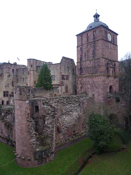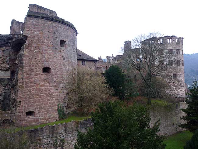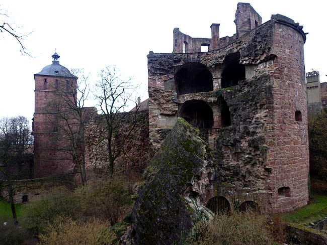 Die Ruine des Heidelberger Schlosses ist ein Konglomerat aus zahlreichen Bauten, von denen die Bausubstanz der Renaissancezeit jedoch für den Gesamteindruck der Ruine prägend ist. Bausubstanz aus dem 12. bis 14. Jahrhundert, verbaut in der Ruine des "Gläsernen Saalbaues", ist für den Besucher optisch nicht mehr wahrnehmbar. Die mindestens zwei mittelalterlichen Burgkapellen sind vollständig verschwunden. Erst die Spätgotik hat aufrecht stehenden Bauten hinterlassen, vor allem den Ruprechtsbau in der Südwestecke und die drei Geschütztürme der Ostseite (Glocken-, Apotheker- und Krautturm), die sekundär zu Wohnzwecken überbaut wurden. Von den Anstrengungen zur Befestigungen des Schlosses zeugen weiterhin der aufgeschüttete Stückgarten im Westen mit einem halbrunden und vor allem mit dem ehemals vollrunden (heute gesprengten) "Dicken Turm". Von daher ist das Heidelberger Schloss im heutigen Bauzustand keine mittelalterliche "Burg" mehr, sondern ein Fürstensitz der Renaissancezeit. Dennoch war es bis 1693 ein Schloss im wörtlichen Sinne, nämlich eine Wehranlage. (Thomas Steinmetz)