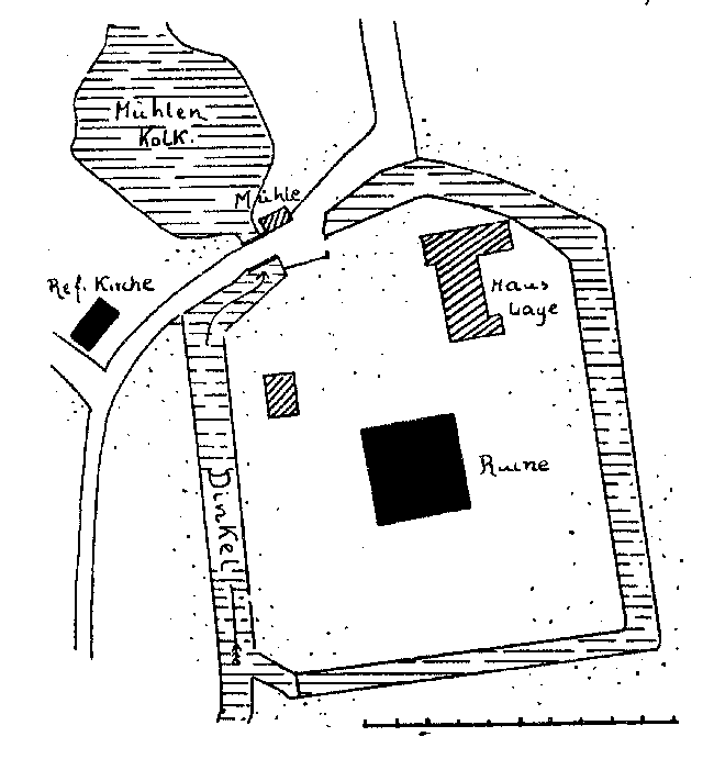 Die erste Burg aus dem 12. Jh. ist 1324/26 zerstört worden. Die kurz darauf errichtete Burg wurde 1380 zerstört. Die nächste Burg aus den Jahren 1445-1447 musste 1576 dem Kastell weichen. Dieses wurde 1626 gesprengt und blieb seitdem als Ruine erhalten. Nördlich davon wurde 1686 ein kleines Herrenhaus errichtet, das 1762 mit Seitenflügeln ergänzt wurde. (Stefan Eismann)