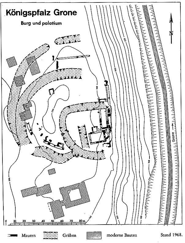 Der älteste Bestandteil des Pfalzkomplexes Grone bildete der Wirtschaftshof in Altengrone, dessen Kirche um 800 errichtet wurde. Die historischen Daten zeigen, dass am selben Platz drei sich ablösende Anlagen gestanden haben, das spiegelt sich auch in den Ausgrabungsergebnissen wieder. Die ursprüngliche und im 10. Jh. zur Pfalz ausgebaute Burg besaß die größte Ausdehnung. Die an ihrer Ostseite stehenden Pfalzgebäude sind einmal erneuert worden, die damit einhergehende Verbreiterung der Grundmauern ging evtl. mit einer Änderung des Aufgehenden von Fachwerk- zu Massivbauweise einher.