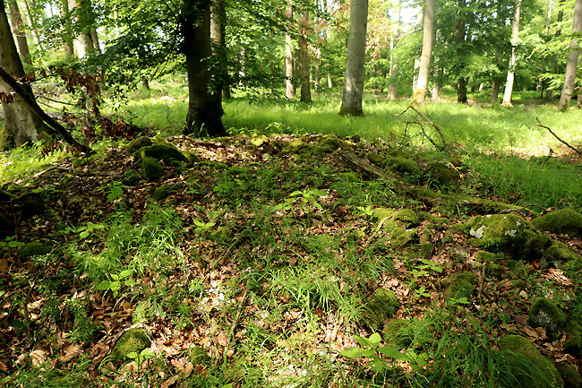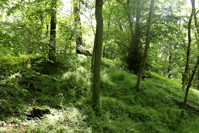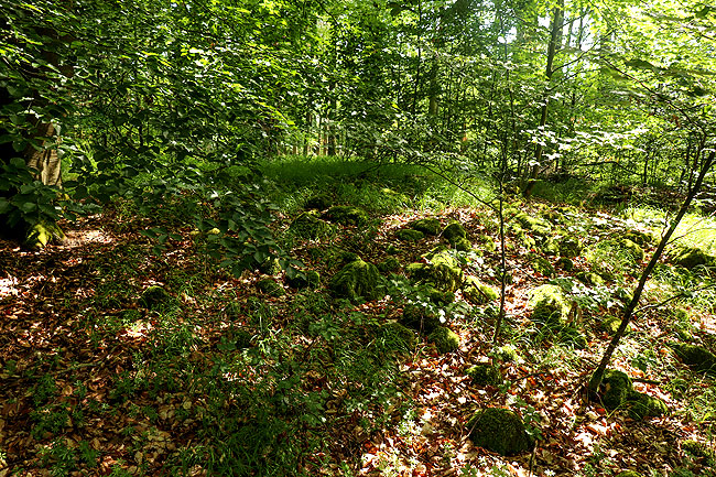 Der Standort der Burg lässt sich nur noch anhand von Geländekanten im Nordwesten und Südosten und einigen Steinhaufen erahnen. Demnach besaß die Burg eine unregelmäßig ovale Form von ca. 136 x 72 m Größe. Ein Steinhaufen an einer Geländekante im Nordwesten könnte den Standort eines Flankenturmes in der Befestigung markieren. (Stefan Eismann)