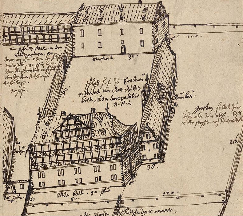 Das Aussehen der Schlossanlage zu Beginn des 17. Jhs. ist anhand von Zeichnungen des Landgrafen Moritz überliefert. Die Wiedergabe des neuen Schlossbaus auf der Westseite der Anlage unterscheidet sich aber auf den jeweiligen Blättern, sodass sie wahrscheinlich nur Studien im Vorfeld des endgültigen Ausbaus darstellen. Einheitlich ist aber die Grundfom als zweigeschossiger, zehnachsiger Massivbau. Das alte Schlossgebäude im Norden wies zwei Steingeschosse und zwei Fachwerkgeschosse sowie einen mittigen Zwerchgiebel auf jeder der beiden Längsseiten auf. Der Marstall im Süden war ein zweigeschossiger Massivbau. Im Osten schloss sich der durch eine Mauer abgetrennte Wirtschaftshof an. (Stefan Eismann)