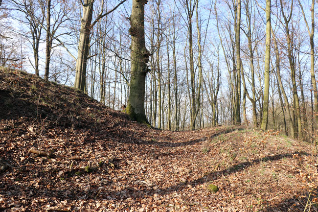 Rund um das Plateau sind die Hänge künstlich versteilt, davor liegt ein runder Hanggraben mit niedrigem Außenwall. An den Steilhängen ist er mittlerweile stark verebnet. Sein besserer Erhaltungszustand am Bergsattel im Osten könnte auf eine ehemals stärkere Ausprägung der Befestigung an dieser Angriffsseite hinweisen. Ein Durchlass durch die Befestigung befindet sich im Nordosten, es ist aber unklar, ob er den ursprünglichen Zugang darstellt. (Stefan Eismann)