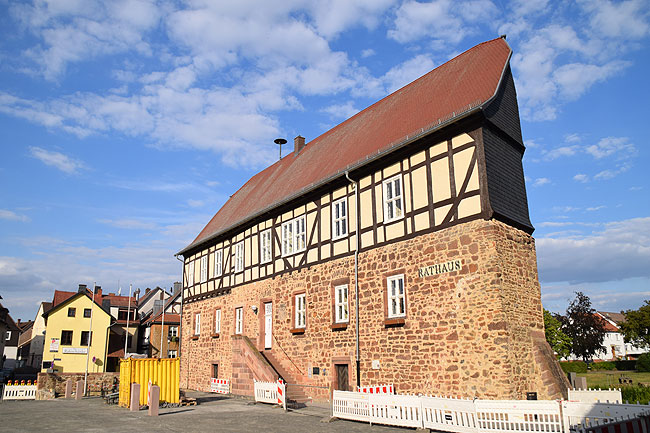 Über älterem Unterbau entstand um 1489 das sog. Dörnbergsche Schloss (Ritterstr. 5), das 1549-1802 mainzisches Amtshaus war und heute als Rathaus dient. Unter Verwendung umfänglicher Teile der älteren Burg wurde das Schloss nach Planung Hans Jakobs von Ettlingen als Zweiflügelanlage errichtet. Das Hauptgebäude ist ein annähernd rechteckiger Bau mit abgeschrägter Ecke, steinernem Keller- und Erdgeschoss und Fachwerkobergeschoss und Polygonalerker über steinerner Säule an der Ostecke. Es trägt ein Satteldach mit Krüppelwalm. Das durch den Umbau Ende des 15. Jh. im Erscheinungsbild spätgotische Gebäude wurde in der Frühen Neuzeit mehrfach umgebaut und verändert, zuletzt 1952 zum Rathaus. Quer zu diesem Trakt steht in der Flucht der ehemaligen Ringmauer im Winkel die einstige Remise (Ritterstr. 9, heute Stadtbauamt) mit Erdgeschoss aus Bruchstein und Fachwerkobergeschoss.