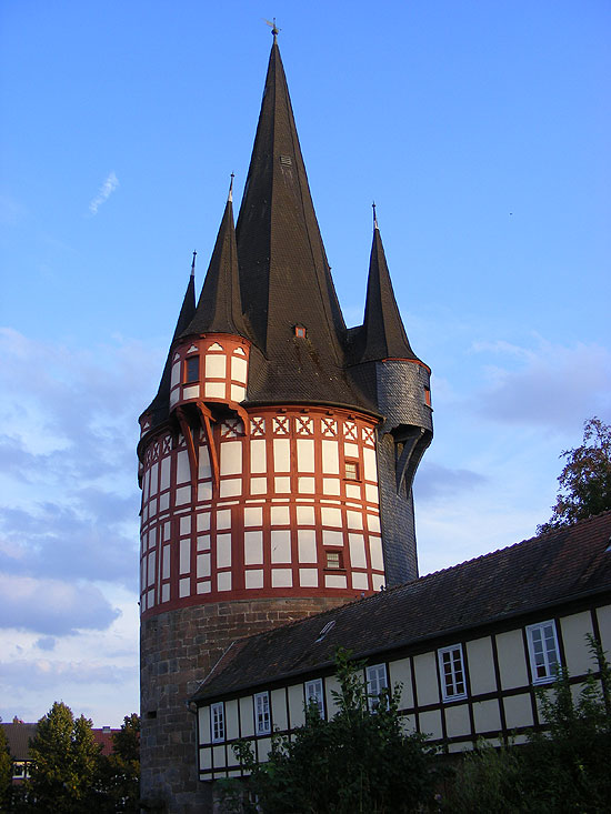 Der Junker Hansen-Turm der Burg, der die Südecke der Stadtmauer sicherte, in die er einband, gilt als der größte Fachwerkrundbau Europas. 1481-83 erbaut (d), setzt sich der über 50 m hohe Rundturm (Ø ca. 13 m) aus zwei in Rotsandstein aufgemauerten Geschossen und zwei Fachwerkgeschossen zusammen. Im Erdgeschoss scheinen Steine abgebrochener ältere Burggebäude zweitverwendet worden zu sein, im 1. OG finden sich sorgfältigere Quader. Beide (durch eine Treppe in der Mauer verbundenen) Geschosse besitzen Maulscharten mit Entlastungsbögen. Unter der Dachtraufe sitzen in allen Gefachen kleine geschweifte Andreaskreuze, die obere Gefachreihe endet in Dreipassbögen. Der Rand des steilen Kegeldaches ist mit runden Eckwarten besetzt, die ebenfalls steile Kegeldächer tragen. Der Junker Hansen-Turm war als Flankierungs- bzw. Geschützturm (EG, 1. OG) und Wohnturm (2. und 3. OG) ein multifunktionaler Bau.