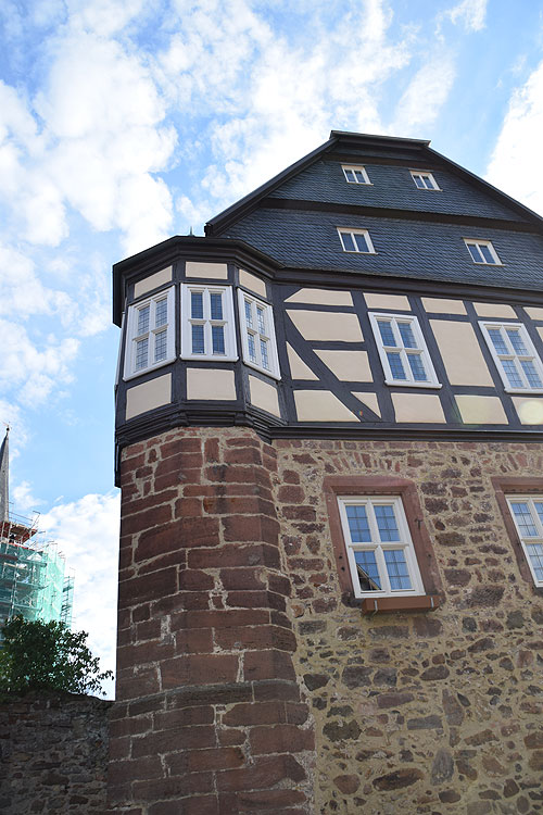 Die Burg steht integriert in den hier eine Ecke ausbildenden südlichen Abschnitt des Stadtmauerberings, dessen Wassergraben mehrere Bachläufe speisten; dem Bering wurde im Spätmittelalter eine Zwingermauer vorgesetzt. Im Grundriss fünfeckig – in Form eine Rechtecks mit abgeschnittener Nordecke – enthält zwar noch Baubestand der Burg der Grafen von Ziegenhain, doch entstammen die erhaltenen Bauten dem Umbau vom Ende des 15. Jh. unter dem Baumeister Hans Jakob von Ettlingen, teils verändert in der Frühen Neuzeit, als die Burg mainzischer Amtssitz war.